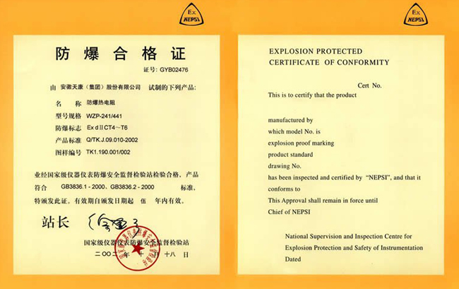 防爆熱電阻領(lǐng)取了由國家級(jí)儀器儀表防爆安全監(jiān)督檢驗(yàn)站出具的防爆合格證