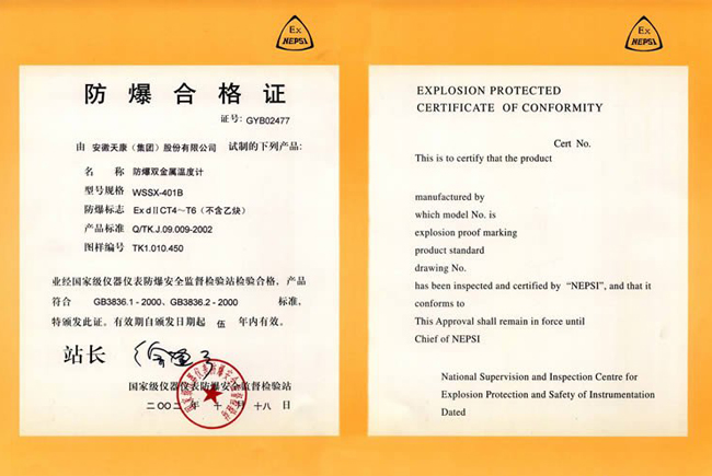 防爆雙金屬溫度計(jì)領(lǐng)取了由國(guó)家級(jí)儀器儀表防爆安全監(jiān)督檢驗(yàn)站出具的防爆合格證1