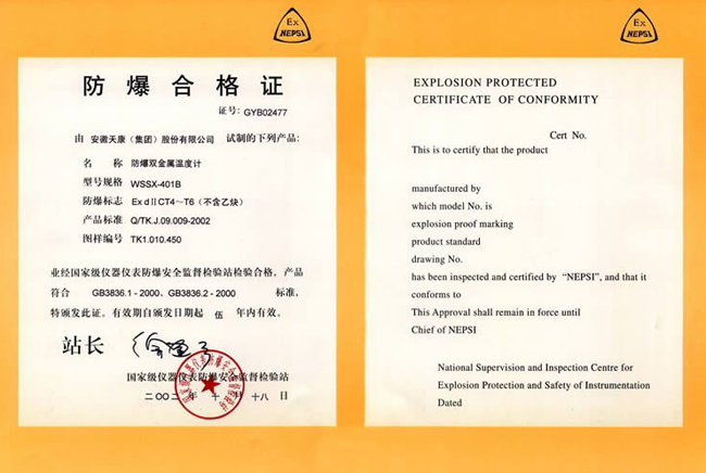 防爆雙金屬溫度計領取了由國家級儀器儀表防爆安全監(jiān)督檢驗站出具的防爆合格證2