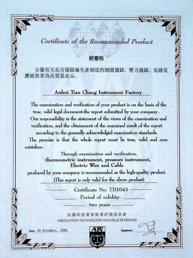 天長市儀表廠生產(chǎn)制造的測溫儀表、壓力儀表、電線電纜被法國科技質(zhì)量監(jiān)督評價(jià)委員