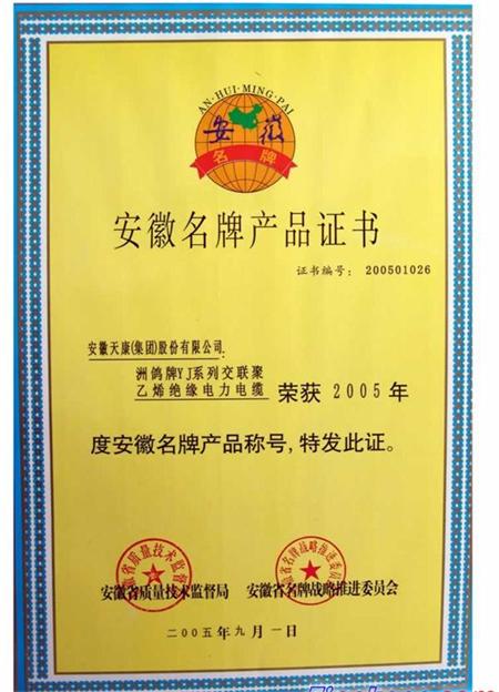 電纜獲安徽省2005年度名牌產(chǎn)品稱號(hào)