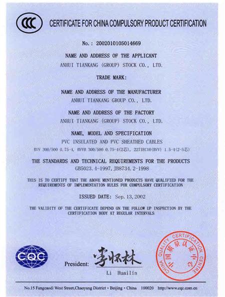 聚氯乙烯絕緣聚氯乙烯護套電纜被中國質量認證中心評為中國國家強制生產(chǎn)產(chǎn)品認證證書英文版