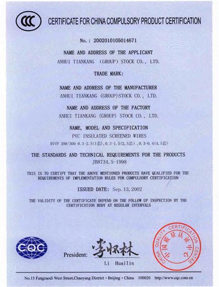 聚氯乙烯絕緣屏蔽電線被中國質(zhì)量認(rèn)證中心評為中國國家強(qiáng)制生產(chǎn)產(chǎn)品認(rèn)證證書3