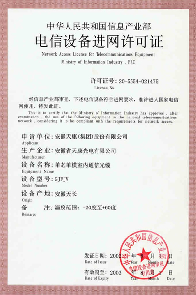 單芯單模室內(nèi)通信光纜獲中華人民共和國(guó)信息產(chǎn)業(yè)部進(jìn)網(wǎng)許可證