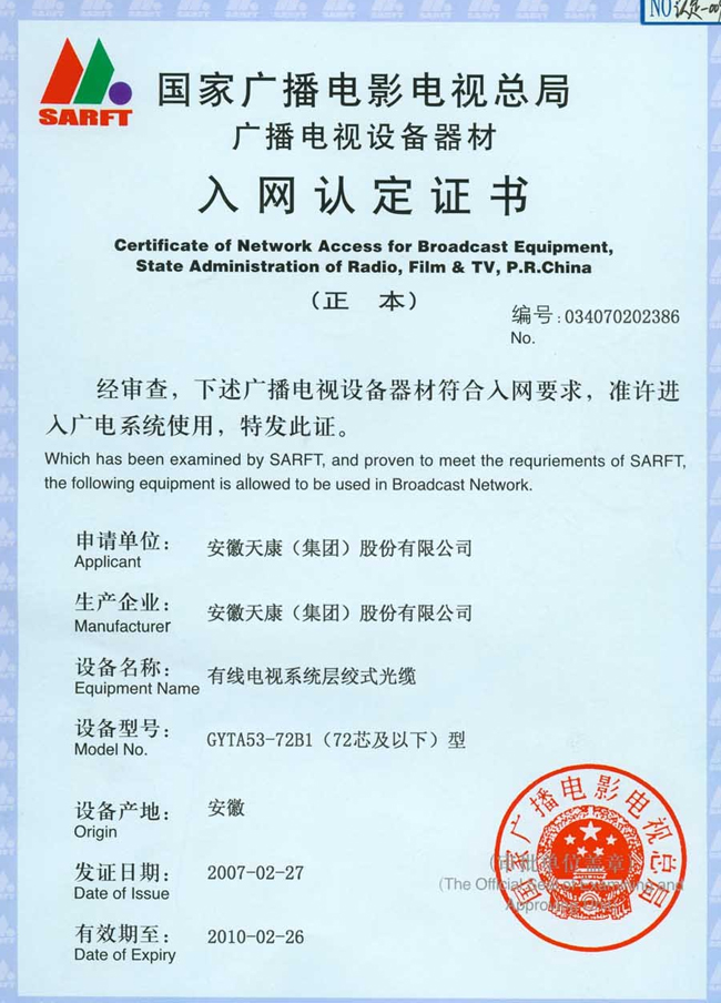 國(guó)家廣播電視總局光纜入網(wǎng)證書72芯