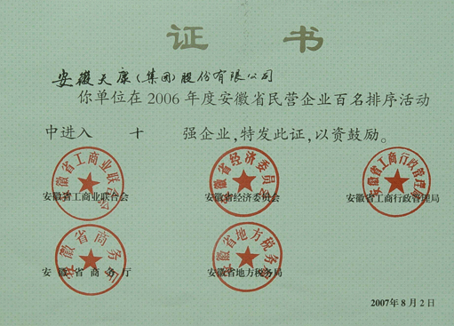 06年安徽省民營十強(qiáng)企業(yè)證書