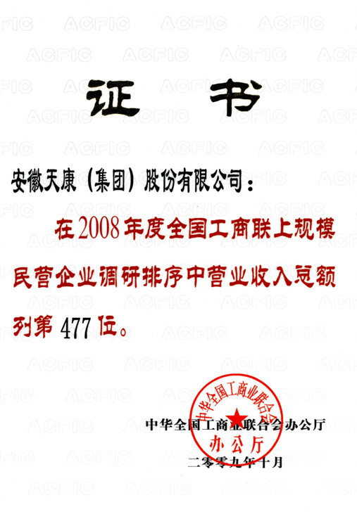 全國工商聯(lián)民企第477位(集團公司08年度)